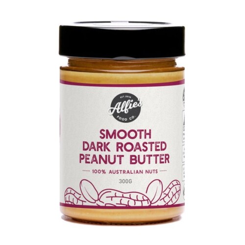 Add a touch of full flavoured distinction to your meals with Alfie's Smooth Dark Roasted Peanut Butter. Made from nothing but the finest Australian grown peanuts home-roasted at just the right temperature to bring out the richest notes these little golden-brown legumes can offer, all with our world-famous Alfie's velvet-smooth texture.
