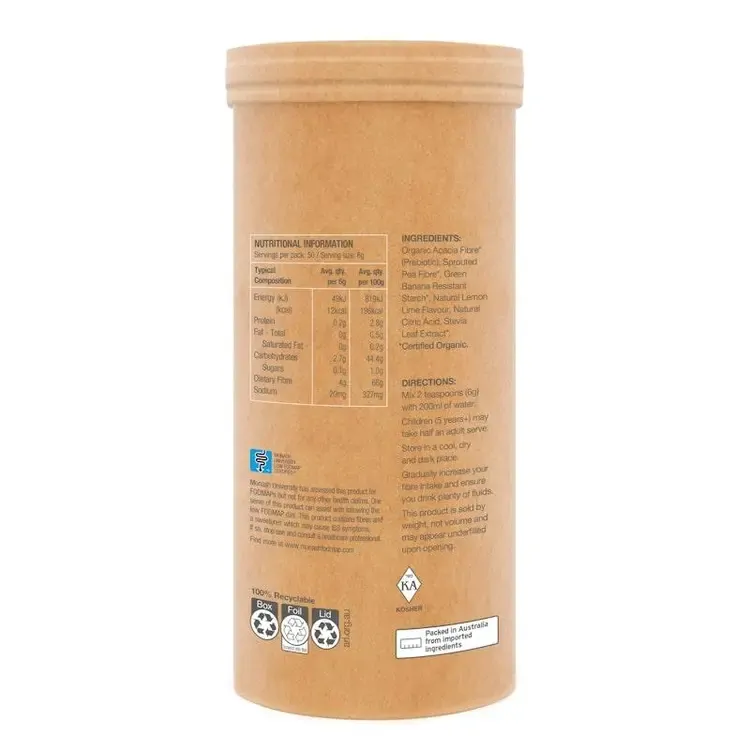 Ingredients: Prebiotic & Organic Acacia Fibre*, Sprouted Pea Fibre*, Green Banana Resistant Starch*, Natural Lemon Lime Flavour, Natural Citric Acid, Stevia Leaf Extract*. *Certified Organic
