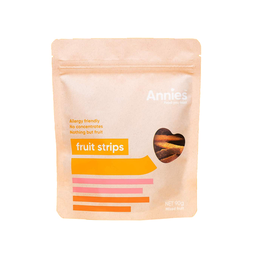 Fruit Strips are all the Annies fruit flavours cut into little strips. Made for little hands, the resealable pouch bags are great for kids on the go. The bite-sized strips are also the perfect lunchbox staple.