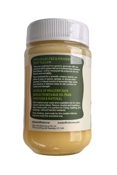 Proudly yellow, Best of the bone beef tallow reflects the purity of 100% grass-fed and finished New Zealand beef tallow. Slow-rendered for a smooth, creamy texture, it’s easy to spoon, spread, and enjoy. No more chiseling off hard chunks! Delivering nose-to-tail nutrition to fuel vitality and support your primal strength. Replace nutrient-poor seed and vegetable oils with our clean, nutrient-dense tallow. Flavour-neutral and boasting a high smoke point, it's perfect for all your cooking needs.