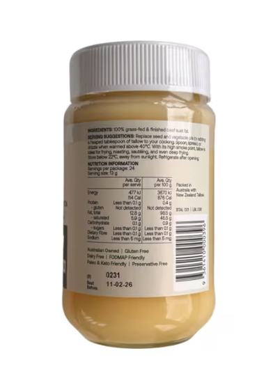How to Use: Simply add a heaped tablespoon to your cooking, replacing seed and vegetable oils. Tallow has a high smoke point, making it suitable for all cooking, including shallow and deep frying. Store below 22C, away from sunlight. Refrigerate after opening