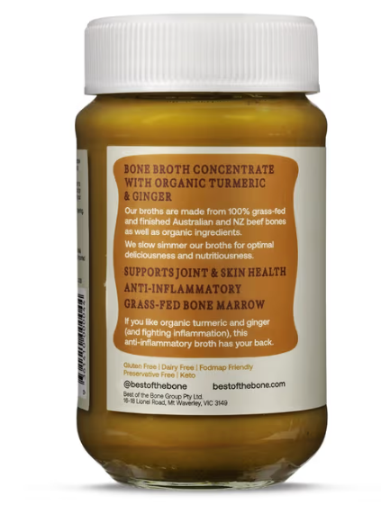 The richest, most nutrient dense slow-cooked (for 48+ hours,) certified grass fed and finished certified bone broth gelatin (NOT powder but a living, enzyme and nutrient rich gelatin) - is packed with natural collagen protein, 19 vital amino acids and 80+ minerals. After we cook the broth we blend in organic turmeric (with 6% active curcumin), organic ginger and organic black pepper. All you need to do is add a cup of warm water to a spoonful of Best of the Bone for quick, delicious and nutritious broths or as a base for rich soups and amazing sauces.
