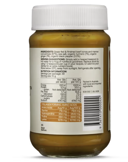 INGREDIENTS: grass-fed/finished beef leg bone extract (broth gelatin) and cartilage, certified organic turmeric (6% active curcumin)/organic ginger/organic black pepper and evaporated sea salt. 39 serves. Best of the Bone - Australian made HACCP, FSIS certified. Refrigerate after opening - will last until 'Best By' date on jar (several months).