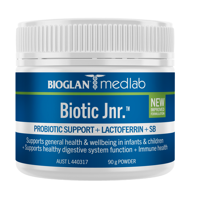 Bioglan Medlab Biotic Jnr™ contains a combination of probiotics, lactoferrin, and Saccharomyces Boulardii which is backed by scientific evidence to support healthy digestive function, immune and skin health in infants and children. Biotic Jnr™ works to support the developing infant and child immune systems, strengthening innate immune function, while supporting digestion and the gut bacteria diversity. The formulation also helps reduce the occurrence of symptoms of eczema and dermatitis in infants and children.