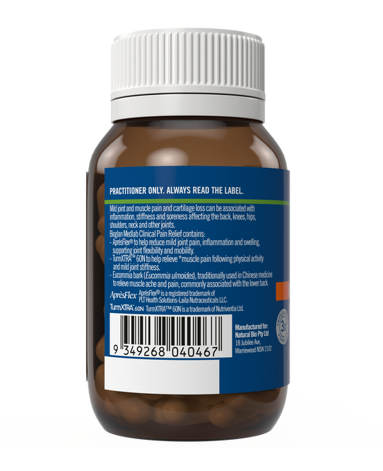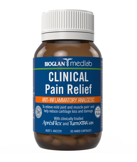 Bioglan Medlab Clinical Pain Relief's triple action formula contains clinically trialled AprèsFlex® and TurmXTRA™ 60N along with Eucommia bark to relieve mild joint pain from 5 days, relieve muscle pain after exercise and help reduce cartilage loss and damage.