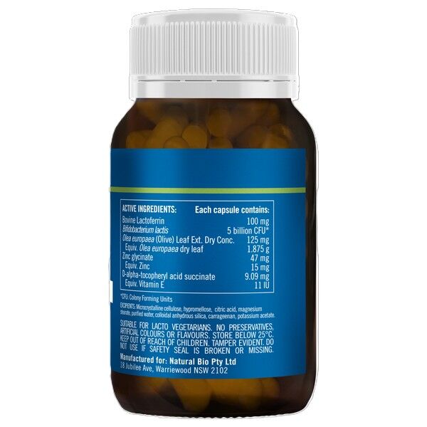 Ingredients: Each capsule contains: Lactoferrin - bovine 100mg, Bifidobacterium animalis ssp.lactis 5 billion CFU, Zinc glycinate 47 mg Equiv. Zinc 15 mg, Olea europaea L (Olive) extract 125 mg Equiv Olea europaea L. leaves 1.875g Equiv. Oleuropein 50mg, D-alpha-tocopheryl acid succinate 9.09 mg Equiv. Vitamin E 11 IU
