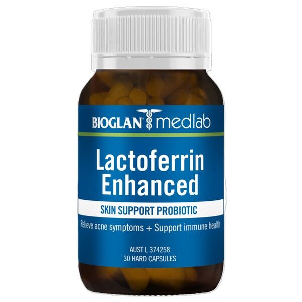 Bioglan Medlab Lactoferrin Enhanced relieves acne symptoms and supports immune health. Bioglan Medlab Lactoferrin Enhanced formulation contains bovine lactoferrin, Bifidobacterium lactis, and olive leaf extract.