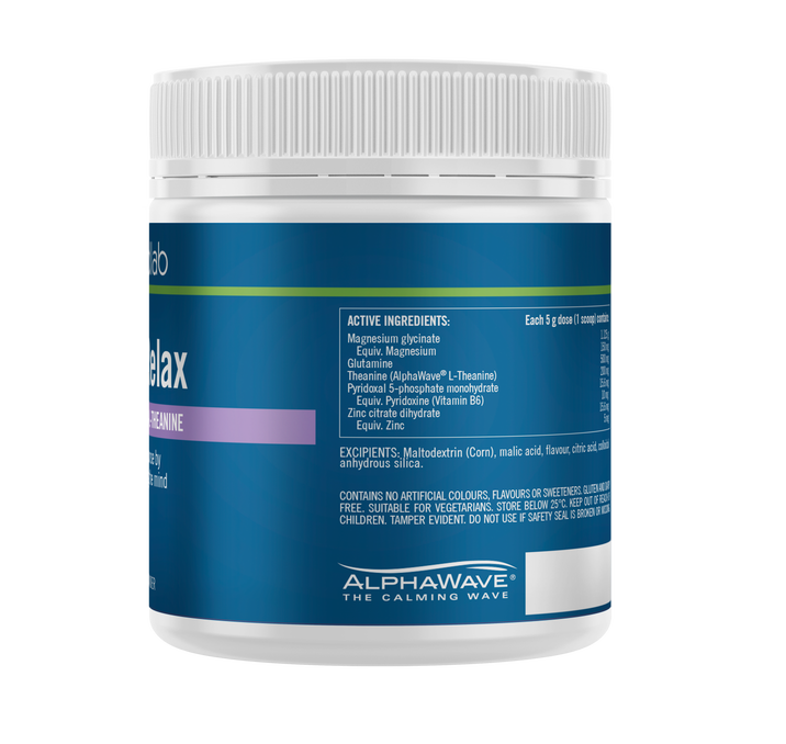 Ingredients: Each 5 g dose (1 scoop) contains: Magnesium glycinate 1.125 g Equiv. magnesium 150 mg Glutamine 500 mg Theanine (Alpha Wave® L-Theanine) 200 mg Pyridoxal 5-phosphate monohydrate 15.6 mg Equiv. pyridoxine (Vitamin B6) 10 mg Zinc citrate dihydrate 15.6 mg Equiv. zinc 5 mg EXCIPIENTS: Citric acid, colloidal anhydrous silica, flavour, malic acid, maltodextrin