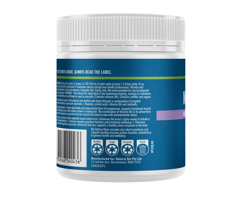 Bioglan Medlab Mg Optima Relax combines high absorption magnesium with L-Theanine and supports a healthy stress response by calming the body and unwinding the mind. Bioglan Medlab Mg Optima Relax supports both physical and mental well-being through a combination of targeted ingredients including magnesium glycinate, L-Theanine, amino acids, vitamin B6 and nutrients. Magnesium glycinate supports functional muscle health, reducing cramps when dietary intake is inadequate. When combined with Vitamin B6 and zinc it assists the body to cope with environmental stress. L-Theanine supports cognitive function and emotional wellbeing. L-Theanine combines with magnesium glycinate, vitamin B6 and zinc to support a healthy stress response in the body.