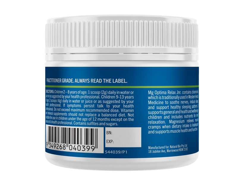 Bioglan Medlab Mg Optima Relax Jnr., contains magnesium and B6 for mind relaxation together with Chamomile which is traditionally used in Western Herbal Medicine for soothing the nerves, inducing sleep, supporting healthy sleeping patterns, and settling upset tummies.