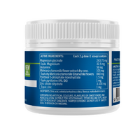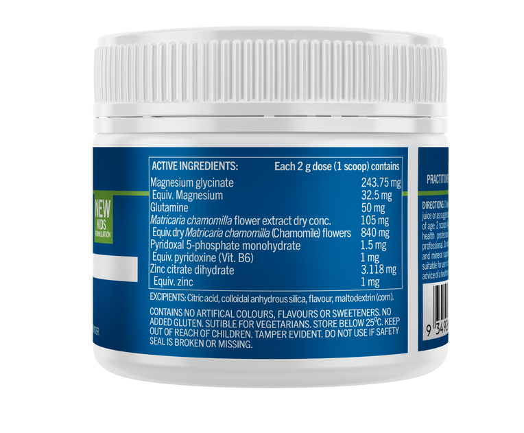 Ingredients: ACTIVE INGREDIENTS: Each 2 g dose (1 scoop) contains: Magnesium glycinate 243.75mg Equiv. Magnesium 32.5mg Glutamine 50 mg Matricaria chamomilla flower extract dry conc. 105mg Equiv. to dry Matricaria chamomilla (Chamomile) flowers 840mg Pyridoxal 5-phosphate monohydrate 1.5mg Equiv. pyridoxine (Vit. B6)1mg Zinc citrate dihydrate 3.118mg Equiv. zinc 1mg.