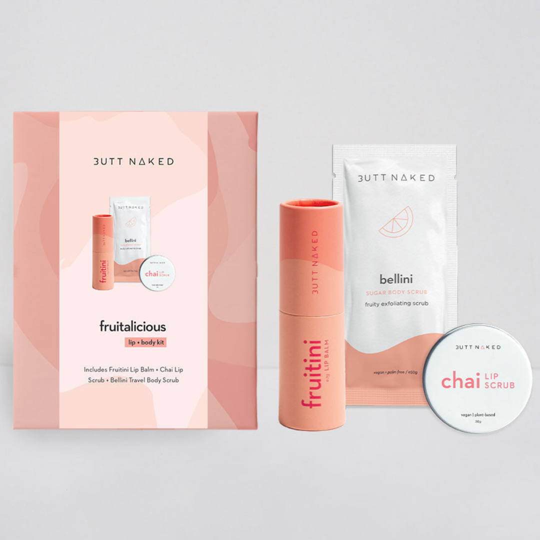 Slather yourself in fruitalicious love! Send your skin and smile on a spa day retreat with this scrumptious trio of must haves. Have skin that's softer than a whisper with Butt Naked bellini body scrub, chai lip scrub for irresistibly smoochable lips and fruitini lip balm that seals in your new found glow. Get ready for epic nights out and let your natural radiance shine through! This set contains Bellini Travel Size Body Scrub 50 g, Fruitini Lip Balm 7 g & Chai Lip Scrub 30 g.