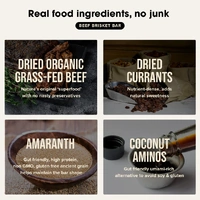 Ingredients: Organic Australian Grass-fed Beef (77%), amaranth flour, chipotle and lime seasoning (dehydrated vegetables, spices, salt, food acids [sodium acetate, citric acid], natural smoke flavour, anticaking agent [calcium phosphate], natural flavours, paprika oleoresin), coconut amino sauce, currants, vinegar, lactic acid, smoke flavour.