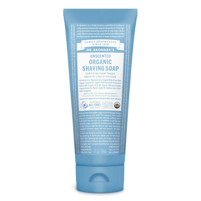 Dr. Bronner's Pure-Castile Baby Mild Soap recipe is as mild and gentle on the skin as the name suggests. This unscented shaving gel contains no artificial or synthetic ingredients, nothing that can irritate or damage the most sensitive of skin. The entire wonderfully natural range from Dr. Bronner's is produced under the fair trade act and the same National Organic Programme that certifies food. You can also be assured that none of it has been tested on animals. The further good news is that the quality of the shaving experience is second to none. With unbelievably smooth glide and effective hair lift and wetting, you can always shave comfortably, effectively and ethically from now on.
