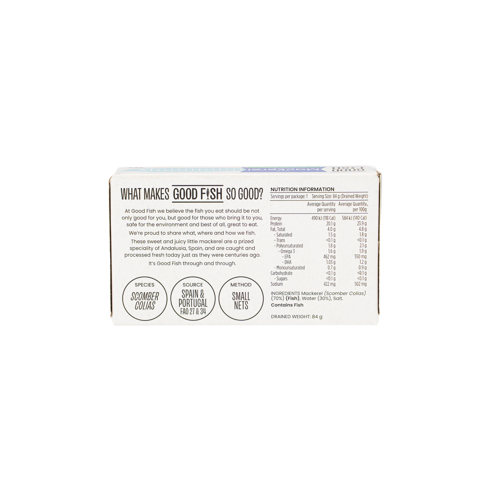 Good Fish Delicious fillets of Spanish Mackerel (Caballa de Andalucia). The Mackerel is caught in a sustainable managed fisheries and once brought to land it is prepared by hand using Spanish artisan skills. This combination results in an outstanding product that is tender and exquisite in taste. Enjoy grilled, roasted, baked, smocked, char-grilled or broiled with lemon