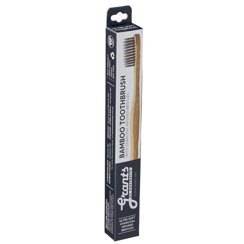 Grants ultra soft bamboo toothbrush with charcoal infused bristles is an eco-friendly way to brush your teeth. The charcoal built into Grants new charcoal toothbrushes helps to fight plaque and bacteria while reducing stains and bad breath. Our handles are made from 100% biodegradable and environmentally sustainable bamboo. The bare bamboo handle can be composted and will safely return to the soil. The bristles aren’t compostable but can be recycled (check with your local recycling facility). Each toothbrush is individually sealed in a paper wrapper that can be composted and the boxes can be recycled.