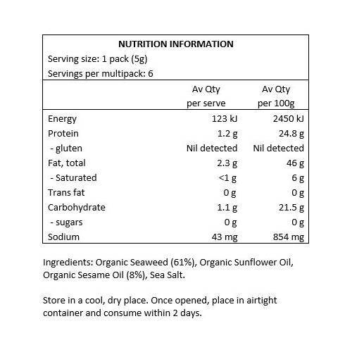 Organic Seaweed (61%), Organic Sunflower Oil, Organic Sesame Oil (8%), Sea Salt. May contain crustacea and fish traces from natural ocean environment.