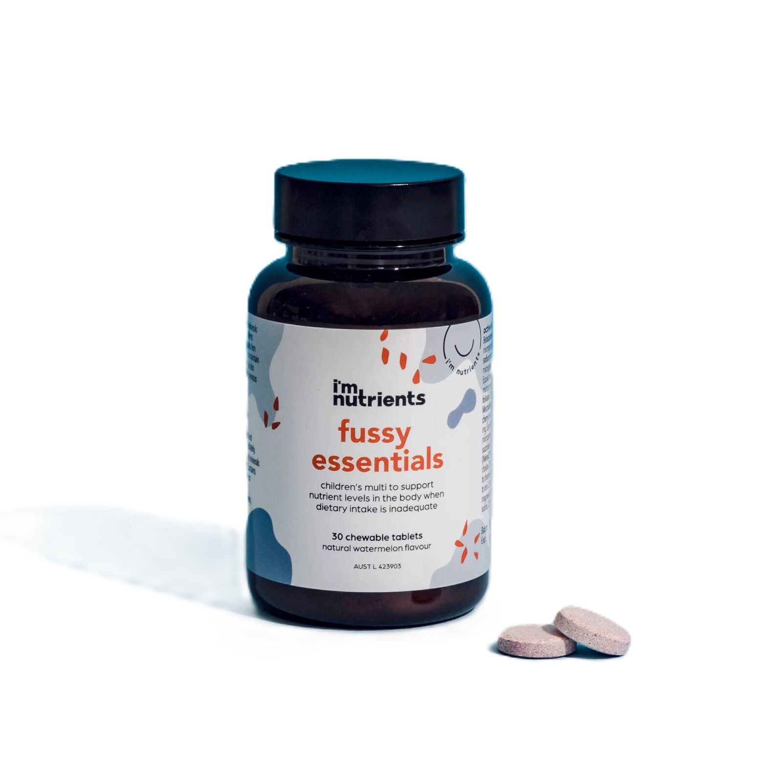 Fussy Essentials is a multivitamin that contains a combination of vitamins and minerals formulated specifically for children to help maintain nutrients within the normal range when dietary intake is inadequate. Fussy Essentials is here to help cover the basics without the added sugar, artificial flavours, or nasties. Just targeted nutrition in a tasty chewable they'll actually take while you keep working on balanced meals.