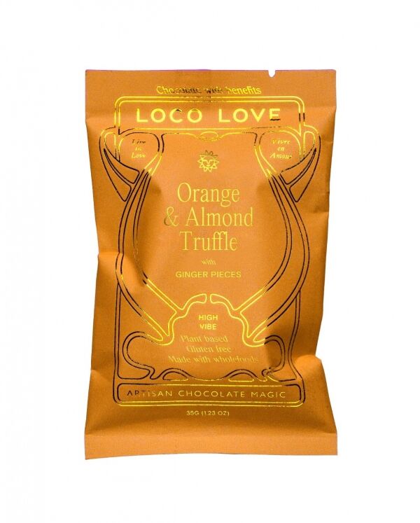 A rich and smooth orange and almond gianduja creamy, grounding, dotted with warming chunks of ginger. Enrobed in single origin dark cacao and topped with tangy orange crystals. Taste uplifting citrus notes blended with spicy ginger and dark earthy cacao; reminiscent of picking fresh oranges with bare feet on the earth. A decadent romance of spice, sweetness, and bright citrus alchemy.