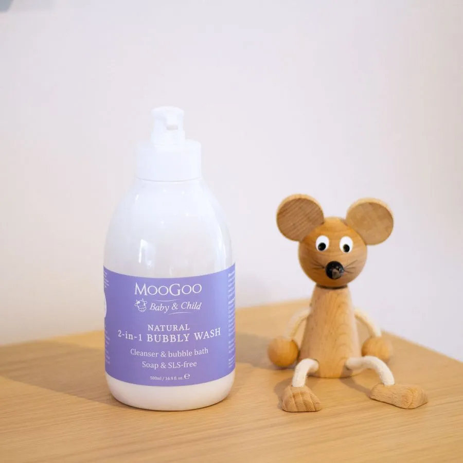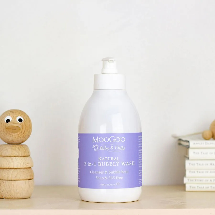 Babies need cleansers in their bath for hygiene. Washing with water alone doesn't remove much dirt and any of the other things babies can get into. But a lot of the commercial wash products out there are made with cheap, synthetic detergents that can strip the skin of its natural oils, leaving it high and dry. MooGoo combine small amounts of 5 different natural cleaners as this can be milder on the skin than one concentrated cleanser.