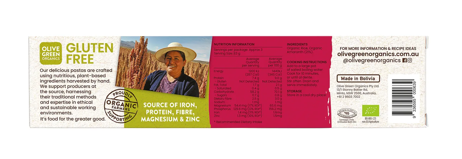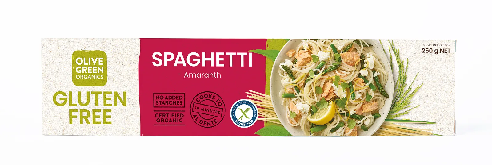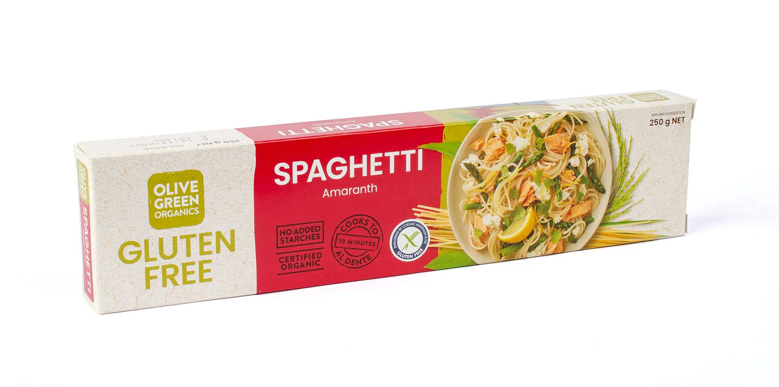 This gluten free pasta stands out for its quality and purity, it is very nutritious and pure, no starches or vegetable gums are added to it. This pasta cooks well, it stays fim and doesn't fall apart like others. Organic rice, organic amaranth, water.