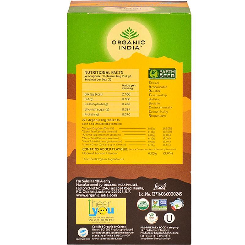 Ingredients of ORGANIC INDIA Tulsi Green Tea Lemon Ginger, Each 1.8 g infusion bag contains: