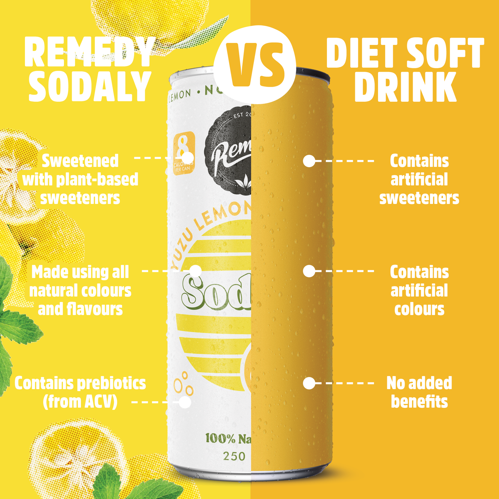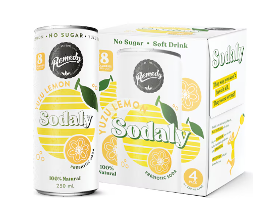 Remedy Sodaly is a great tasting, all-natural prebiotic soft drink that’s big on flavour and low on guilt! Packed with the lively essence of Japanese yuzu and tangy lemon, this banger of a bevvie delivers a knockout burst of citrus goodness. With its playful fizz and uplifting flavour, it's the ultimate refresher for any time of day!