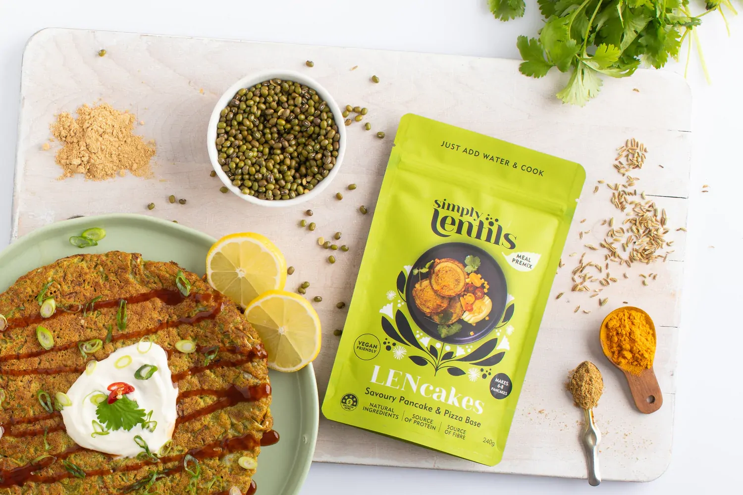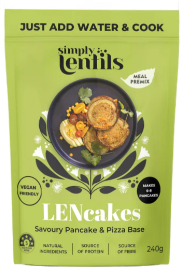 Simply Lentils LENcakes - A blend of prebiotic green mung bean flour with spices to make savoury pancakes for a healthy protein breakfast or as a pizza base. LENcakes premix is created using Mung beans as the key ingredient. With 22gms of protein in 100gms of LENcakes, they are a great protein filled brekky or a quick snack anytime. Enjoy them on their own with a dip or create a meal by topping it up with a choice of your favourite salad or veggies.