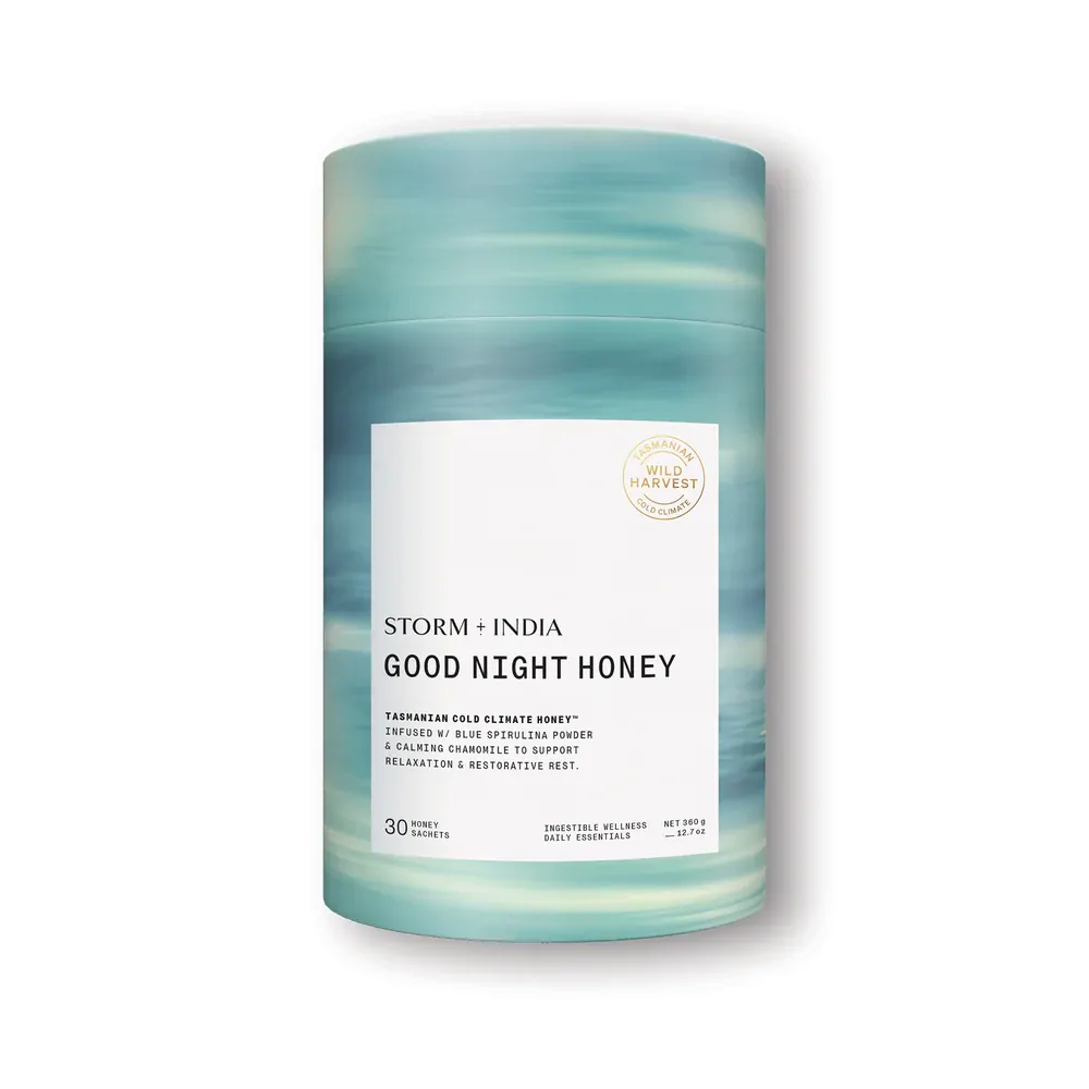 Storm and India Good Night Honey is a nutrient-rich formula designed to support relaxation and improve sleep quality. With Blue Spirulina, Passionflower, Chamomile, and Lavender extracts, it helps reduce restlessness and calm the mind, promoting a natural transition into deep, restorative sleep. Rich in antioxidants, vitamins and minerals, this honey from the pristine wilderness of Tasmania offers pure, potent wellness power.