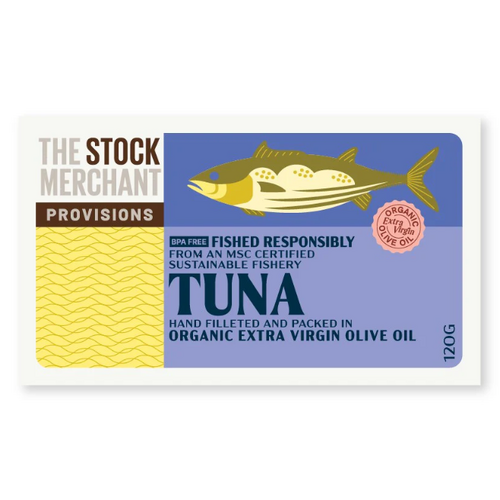 Responsibly fished MSC certified Tuna, preserved in certified organic extra virgin olive oil. Hand filleted and packed. The Stock Merchant Provisions is a collection of ethical, quality fare for everyday dining. We believe in real food, and we work closely with producers who provide us with superb ingredients. This premium tinned seafoods are ready to serve as a quick lunch, canapé or dinner. They’re extra-sensational served with shallots, avocado, herbs and a generous dash of lemon.