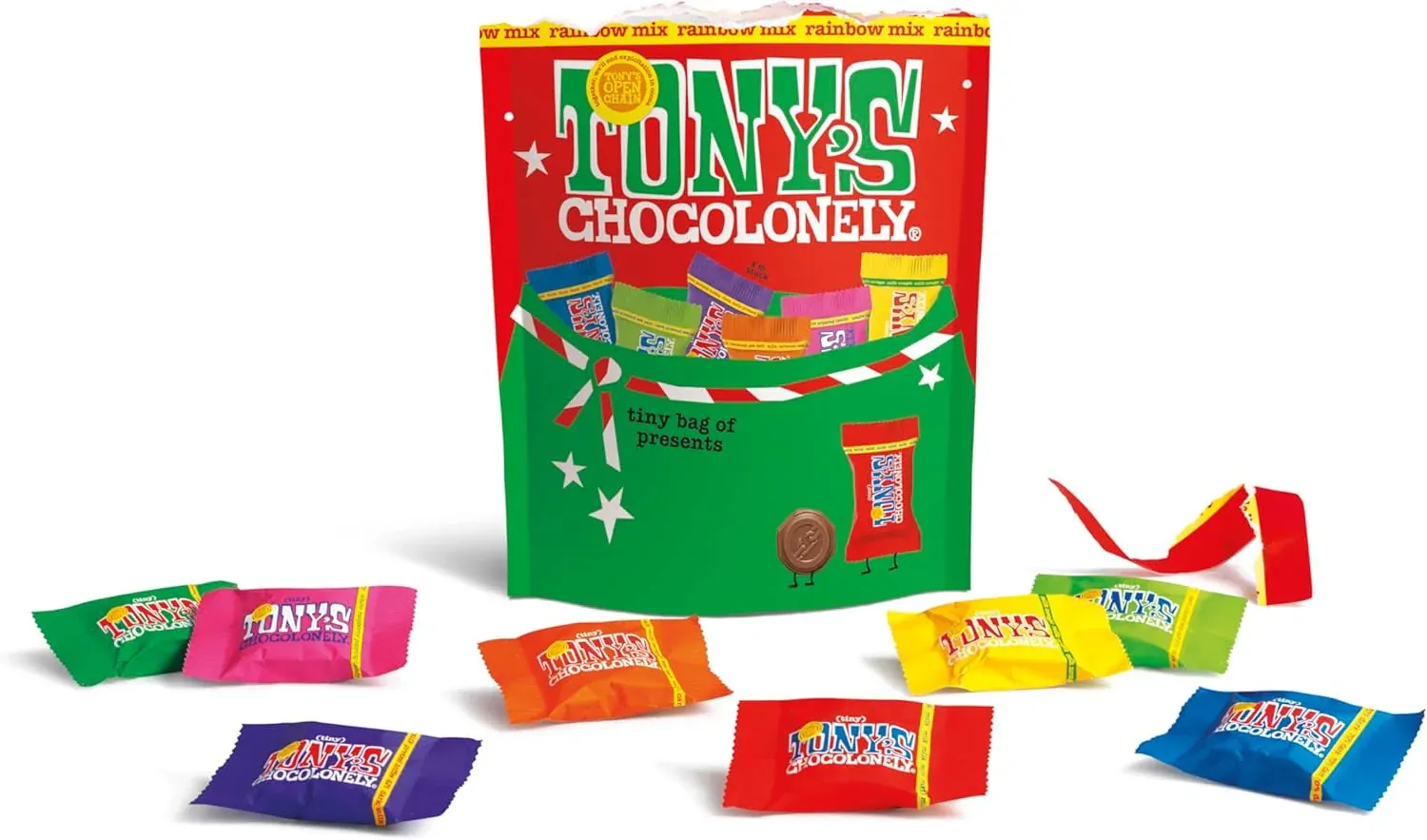 Celebrate the festive season with Tony’s Xmas Tiny Rainbow Mix. This delightful mix features rich Milk Chocolate, Dark Milk Chocolate Pretzel Toffee, Milk Chocolate Caramel Sea Salt and Dark Chocolate Almond Sea Salt, crafted from quality ingredients including cocoa mass, dried whole milk, almonds, caramel, and pretzel pieces. Made by Tony’s Chocolonely, it proudly supports ethical sourcing and fair trade.