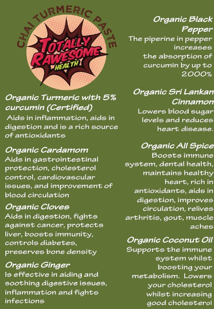 Totally Rawesome Chai Activated Turmeric Paste is made fresh, using wholefood ingredients.
