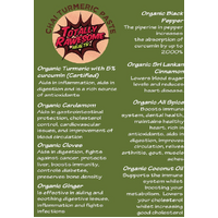 Ingredients: Turmeric 5% curcumin (Certified , and Tested)*, Black Pepper*, Organic Coconut Oil*, Sri Lankan Cinnamon*,Ginger*,Cardamom, All  Spice*,Cloves* *Denotes Organic.