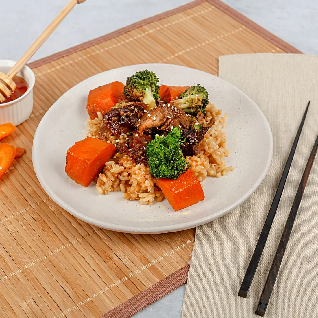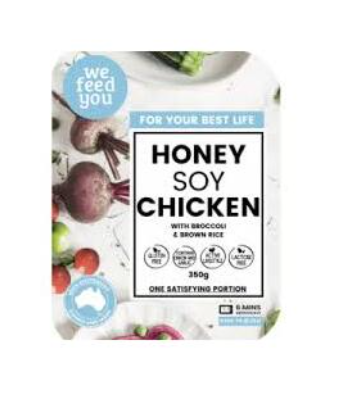 Ingredients: Chicken Thigh (32%), Water, Carrot (14%), Broccoli, (14%), Brown Rice (11%),  Brown Onion, Tamari Gluten Free Soy Sauce (Whole soybeans, water, sea salt, alcohol), Honey, Rice Vinegar (Water, Alcohol, Rice, Sake Cake Extract), Garlic, Ginger, Sesame Oil, White Sesame Seeds.